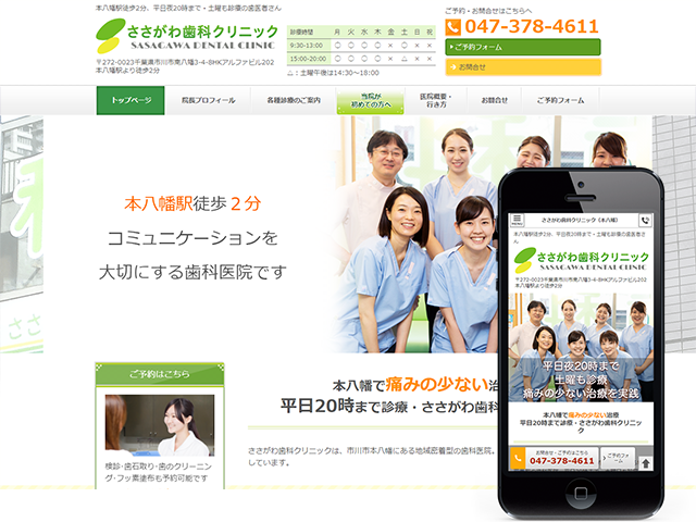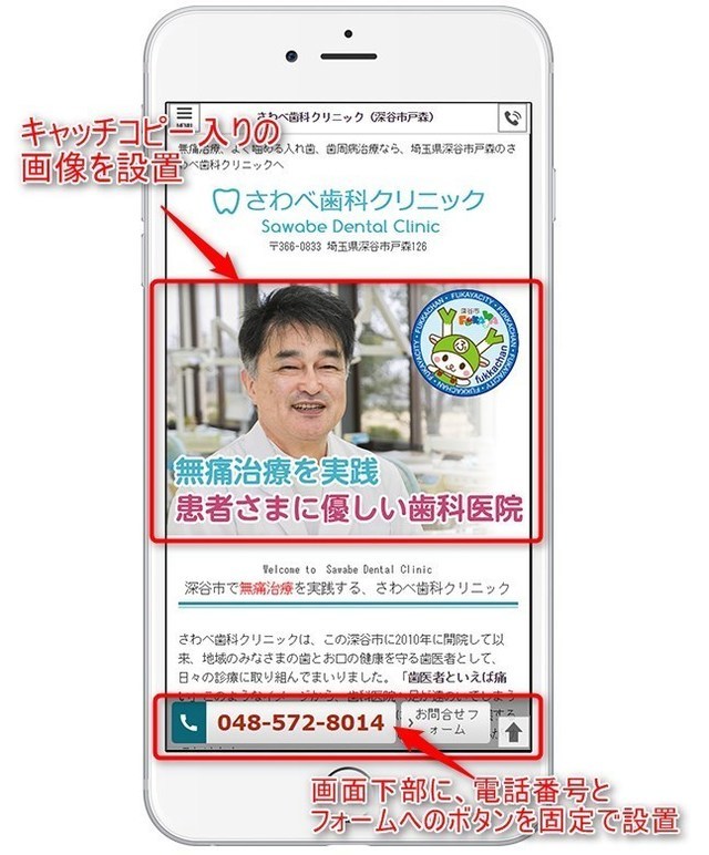 Google基準に準拠のスマホサイトを作成( レスポンシブ、モバイルファースト)。ワンタッチで予約ができる「電話ボタン」や「予約フォームボタン」を設置した、予約につながりやすい設計です。