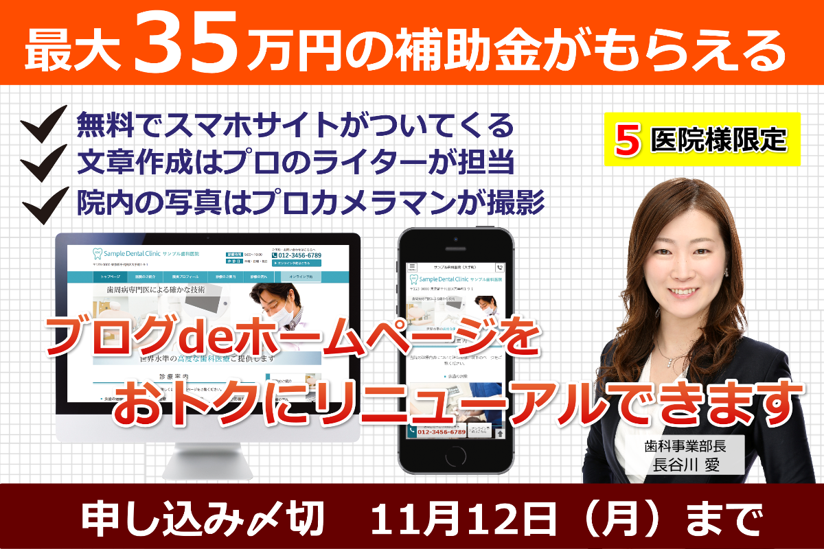 【ブログdeホームページ】のサイトは、以下の特徴をもつ弊社の新システム【あきばれホームページ歯科パック】でリニューアルいたします。プロの手でお得にリニューアルできるこの機会をぜひ、お見逃しなく!