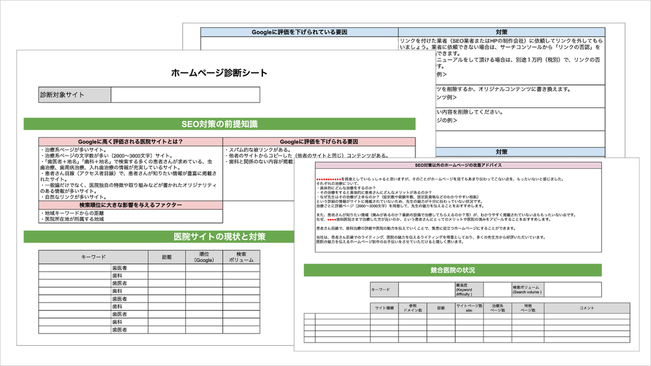 ご相談いただいた先生には、「ホームページ診断」や「SEO診断」、「医療広告ガイドライン診断」等の無料提供も行っています。
